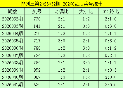 开奖回来:摆列三第2026041期奖号为:639,其奇偶比为2:1,大小比为2:1,奖号012路比为3:0:0。
