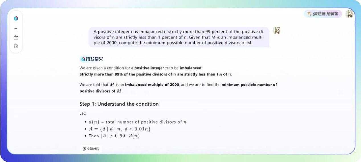 这是2025年11月哈佛-麻省理工数学锦标赛(HMMT)里的沿途英文题目,难倒国内主流模子,但星火X2在分析念念考后,不仅给出了正确谜底,还给出了醒主宗旨题过程。